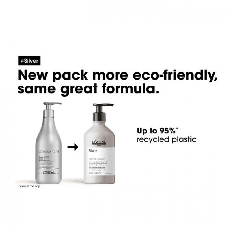 Showcase the beauty of grey, white or light blonde hair with L'Oréal Professionnel Silver Shampoo. The neutralising system, enriched with magnesium and anti-yellowing agents, counteracts unwanted brassy tones.